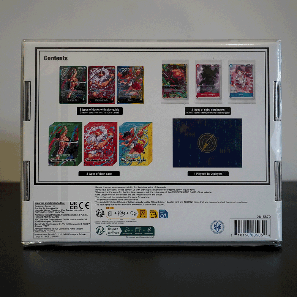 The Learn Together Deck Set (LT-01) is the perfect entry point into the One Piece Card Game! This set includes three beginner-friendly decks, designed so you can learn the rules step by step while playing with a friend. Featuring exclusive tutorial cards, play guides, and everything you need to start playing right away, it’s the ideal way for new players to dive into the world of One Piece TCG!